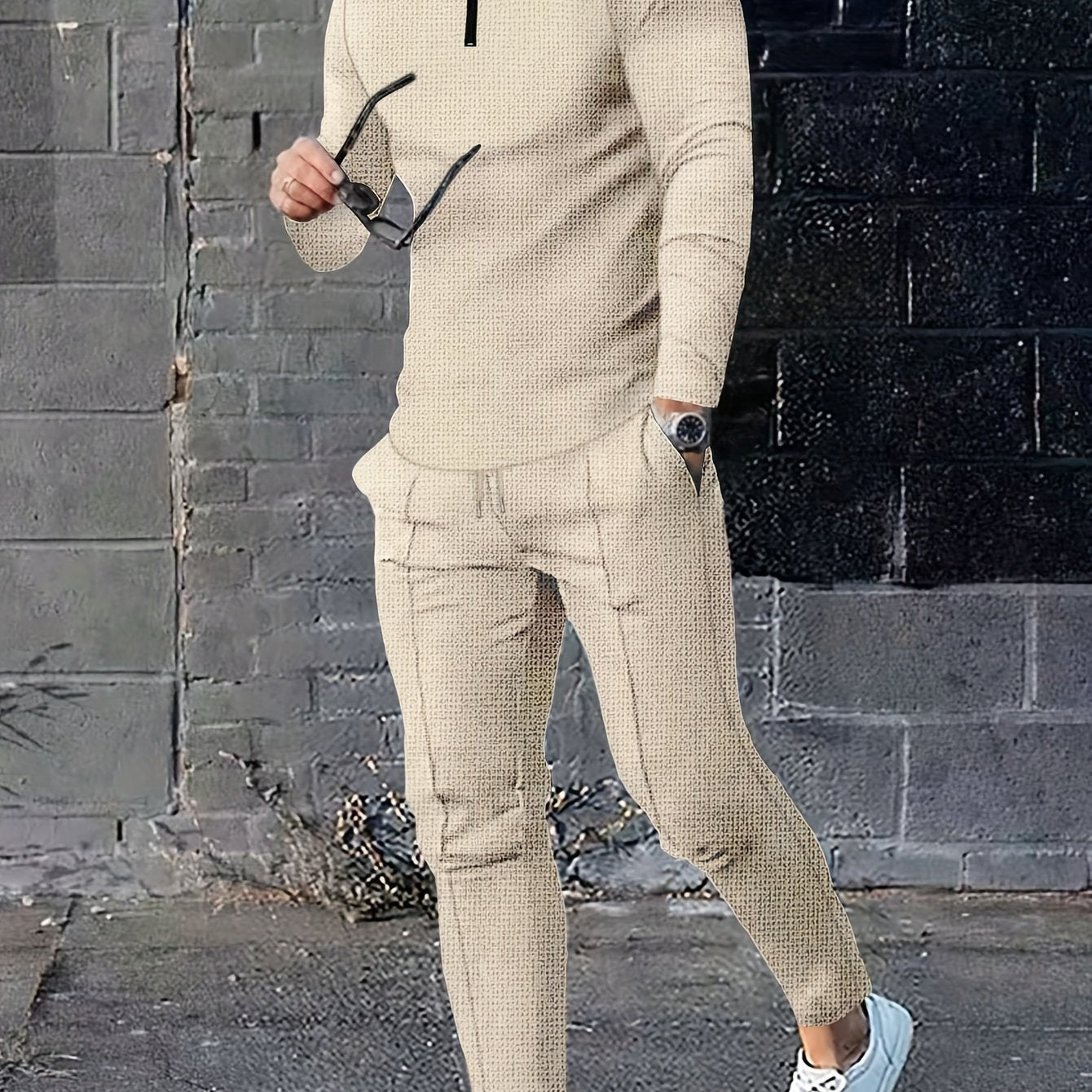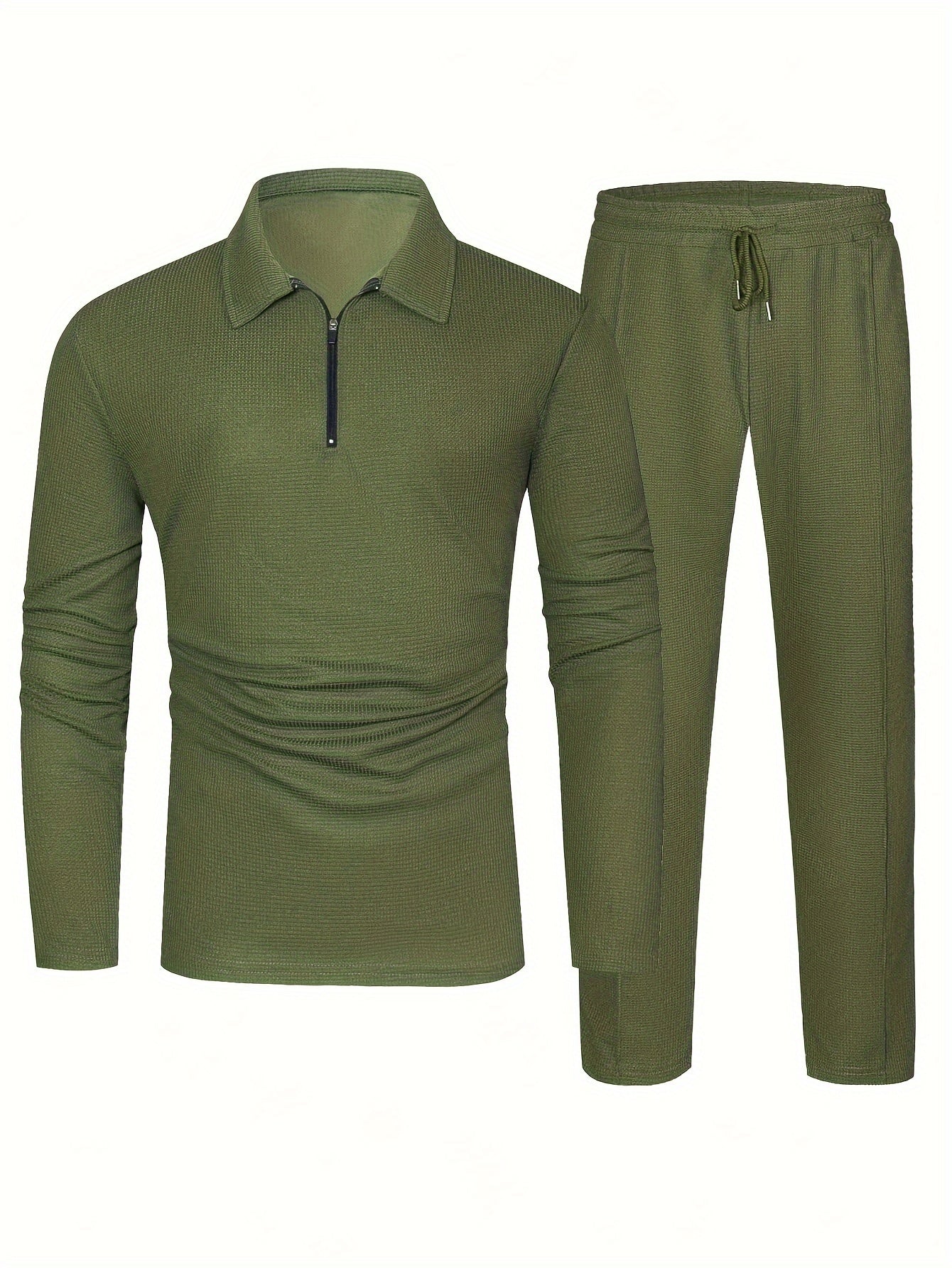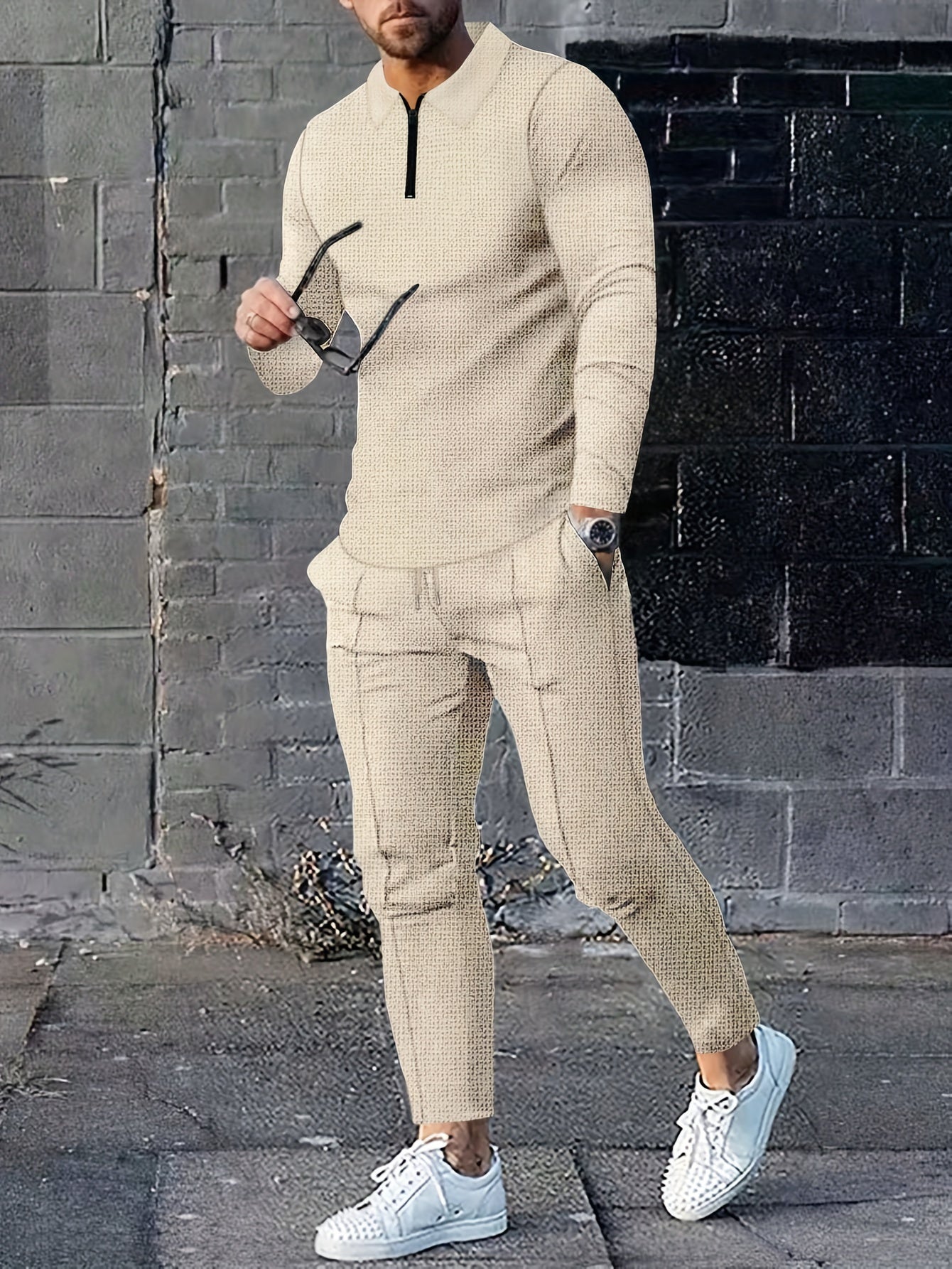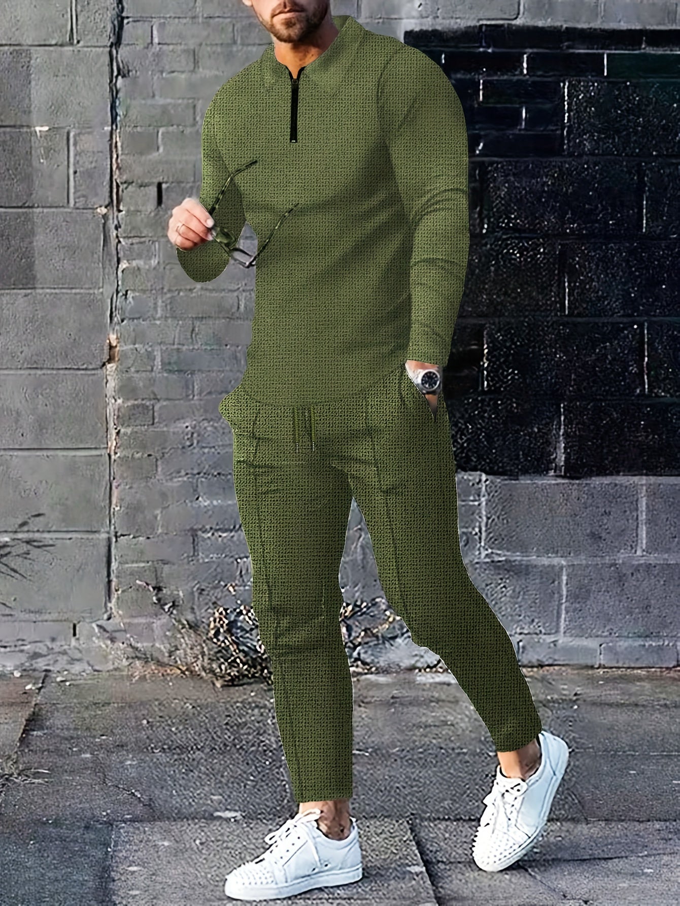 Stylowy męski zestaw dresowy, idealny na co dzień oraz na mniej formalne okazje. Bluza z długim rękawem i eleganckim kołnierzykiem z zamkiem dodaje sportowego szyku, a spodnie z elastycznym pasem zapewniają wygodę i swobodę ruchów. Wykonany z wysokiej jakości materiału, który doskonale dopasowuje się do sylwetki, ten zestaw łączy w sobie komfort z modnym wyglądem.