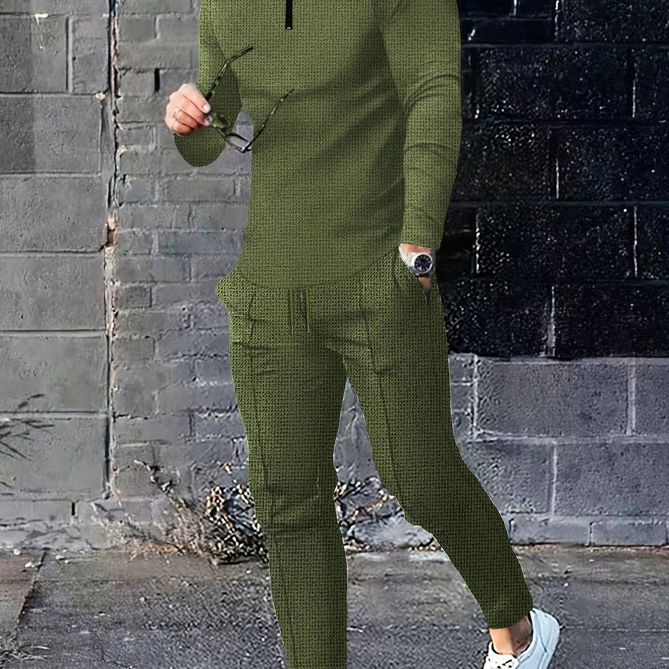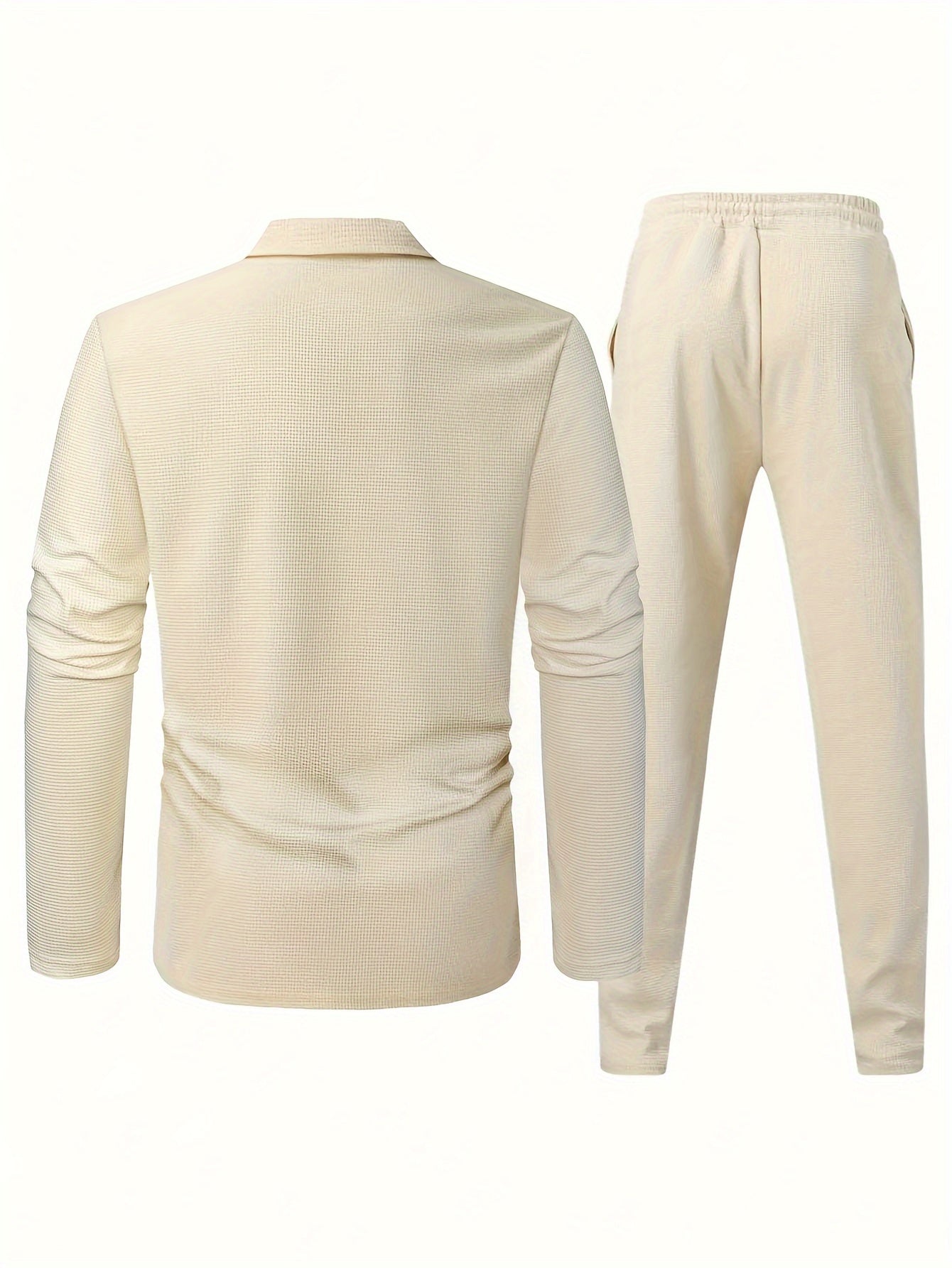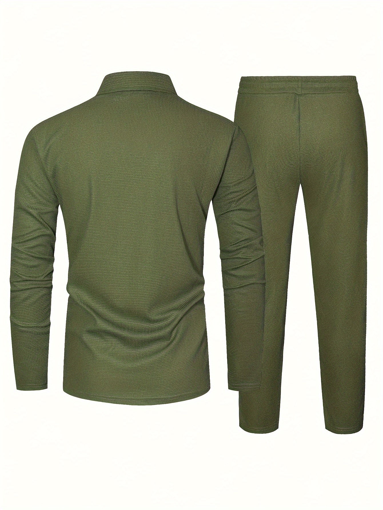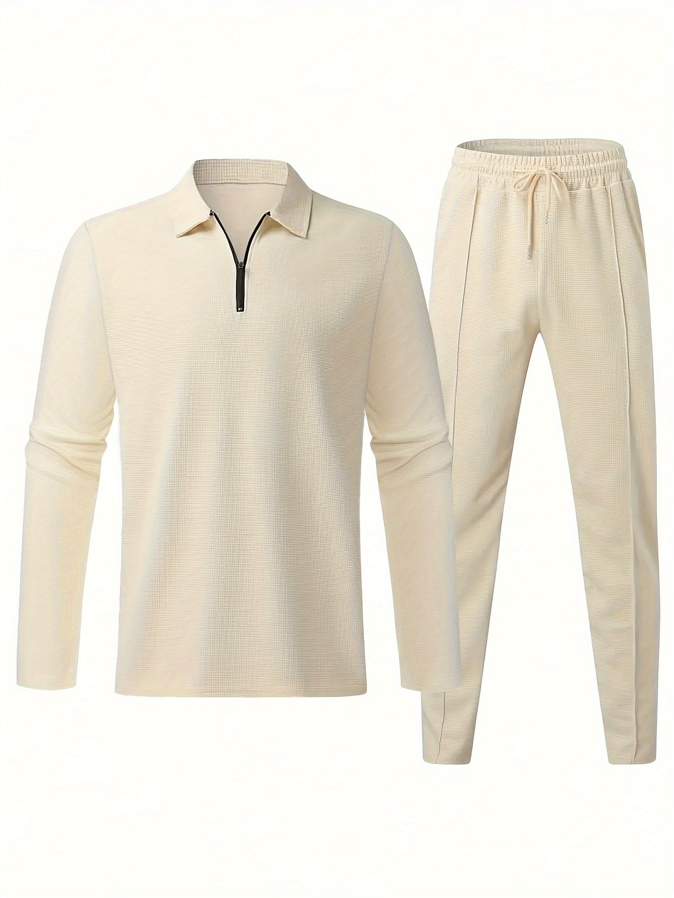 Stylowy męski zestaw dresowy, idealny na co dzień oraz na mniej formalne okazje. Bluza z długim rękawem i eleganckim kołnierzykiem z zamkiem dodaje sportowego szyku, a spodnie z elastycznym pasem zapewniają wygodę i swobodę ruchów. Wykonany z wysokiej jakości materiału, który doskonale dopasowuje się do sylwetki, ten zestaw łączy w sobie komfort z modnym wyglądem.