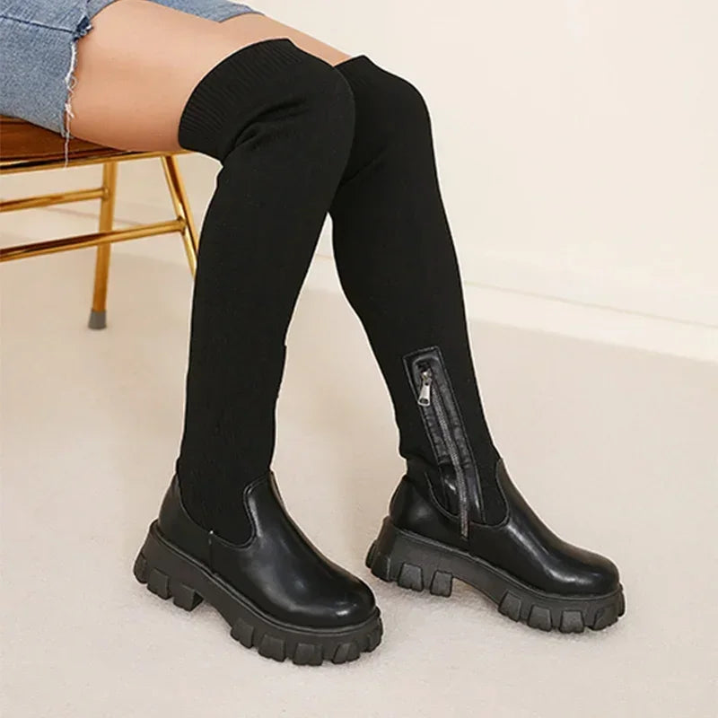 Nowoczesne kozaki damskie za kolano z elastyczną, dzianinową cholewką i masywną traktorową podeszwą to hit sezonu! Świetnie dopasowują się do nogi dzięki prążkowanemu materiałowi, a wsuwany fason z bocznym zamkiem zapewnia szybkie i wygodne zakładanie. Gruba podeszwa dodaje charakteru i gwarantuje komfort noszenia na co dzień. Idealne do sukienek, spódniczek lub legginsów – na jesień i zimę.