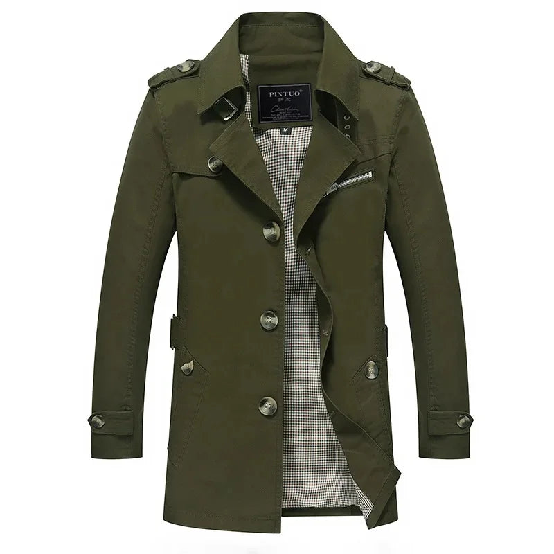 Męski płaszcz przejściowy z klapami, styl casual-elegancki, zapinany na guziki