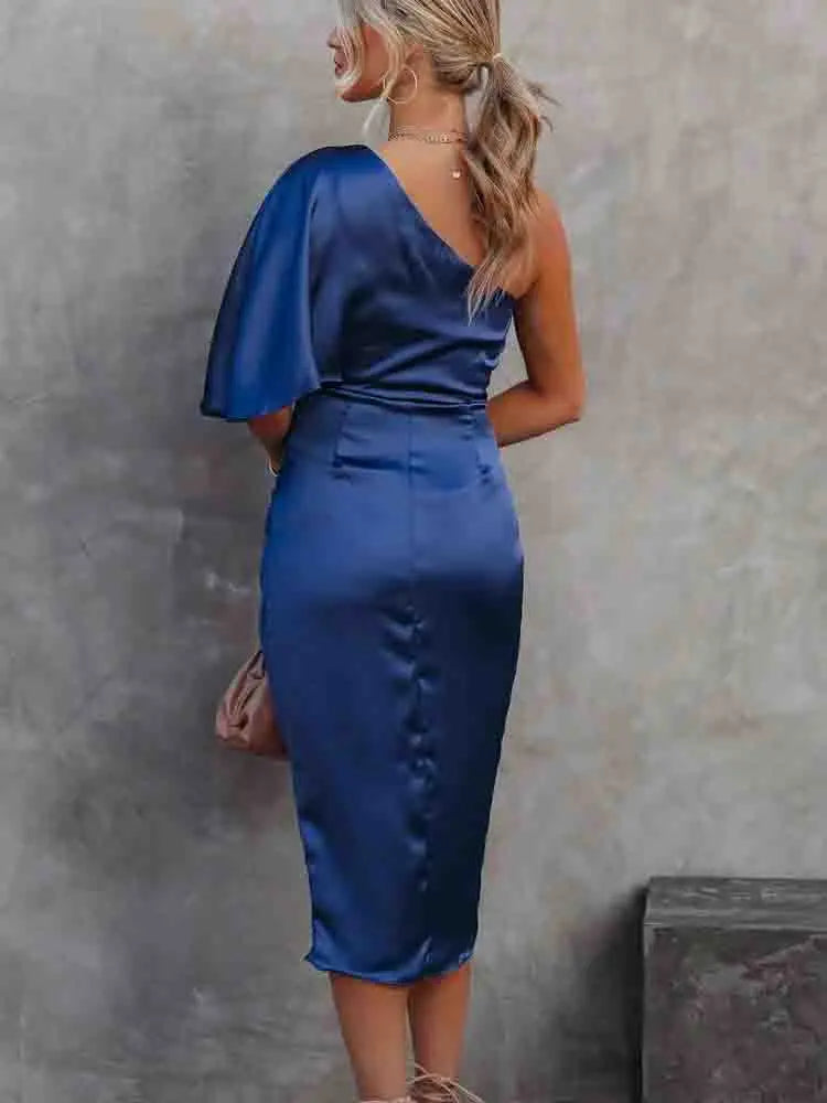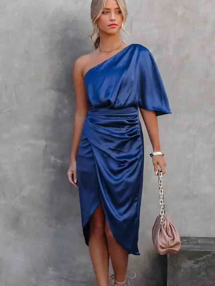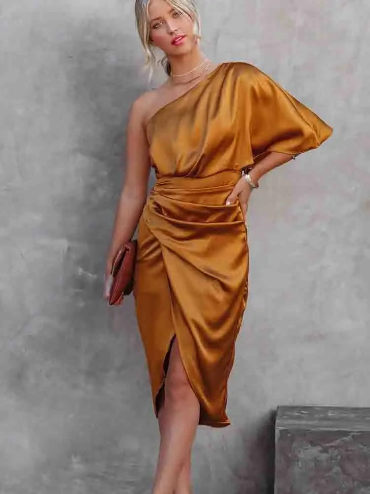 Satynowa sukienka asymetryczna z odkrytym ramieniem