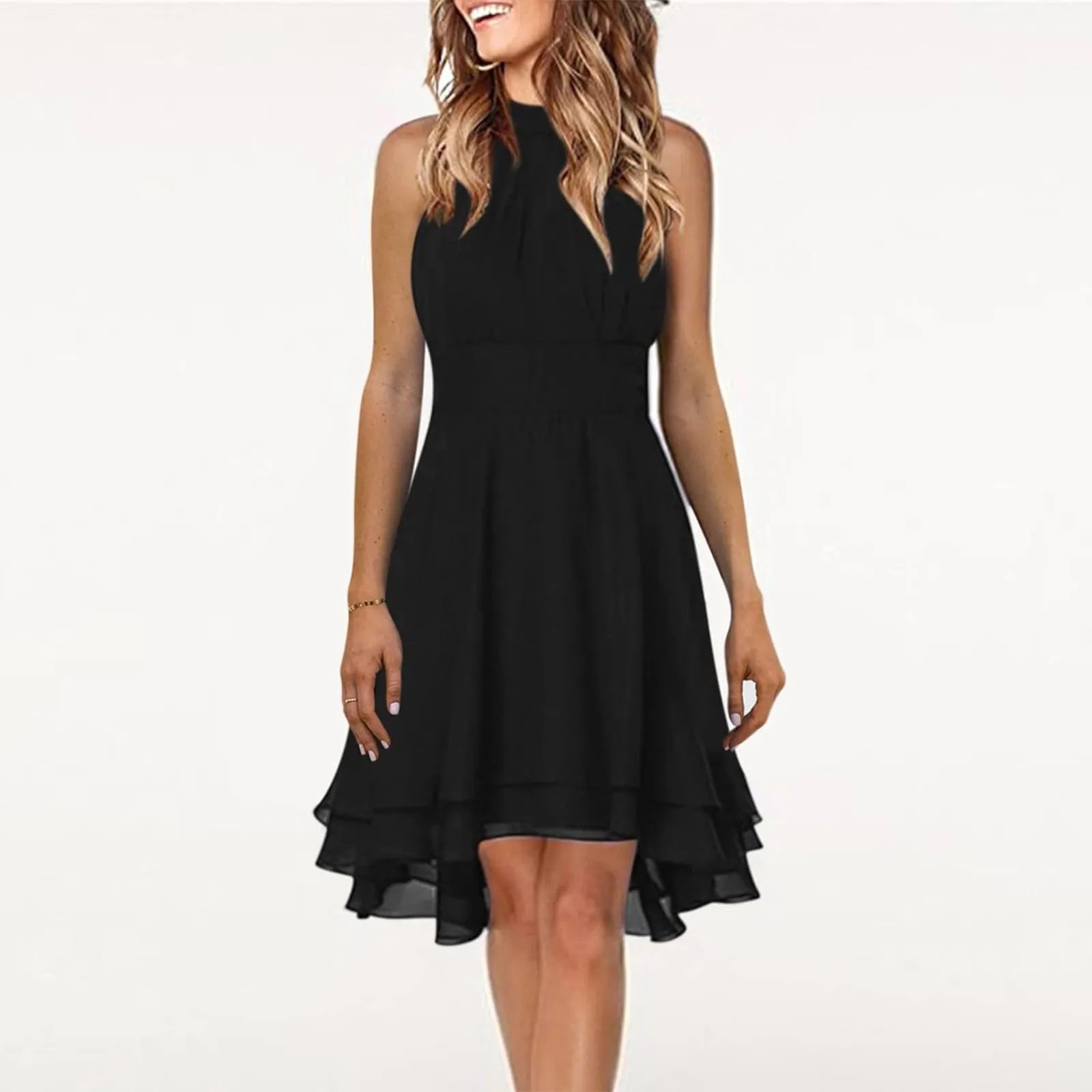 Stylowa i elegancka sukienka, która zachwyca lekkością i subtelnym krojem. Wysoki dekolt dodaje klasy, a dopasowana talia podkreśla sylwetkę. Asymetryczny dół z delikatnie warstwowym wykończeniem nadaje sukience romantycznego charakteru. Wykonana z lekkiego, przewiewnego materiału, doskonale sprawdzi się na letnie przyjęcia, wesela lub wieczorne wyjścia.