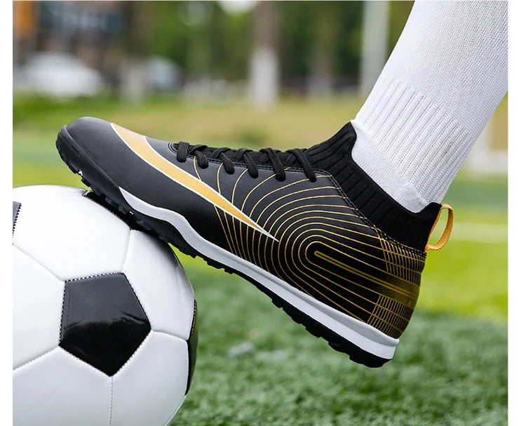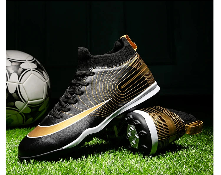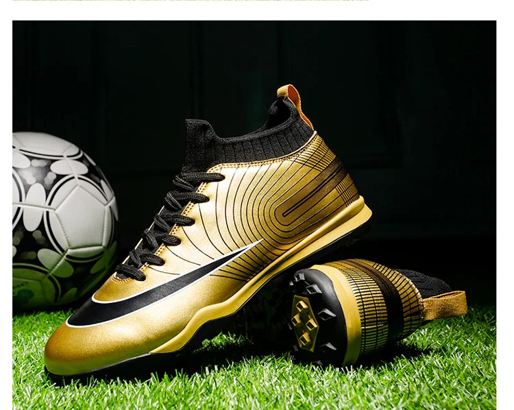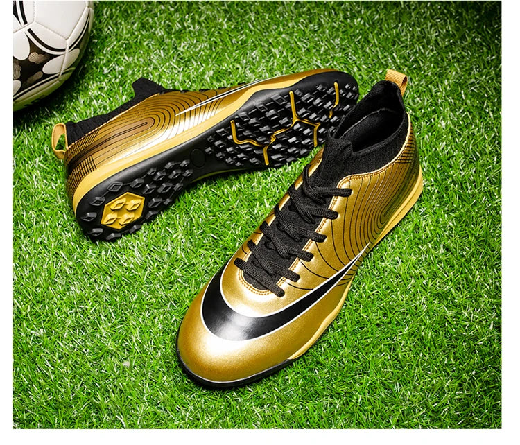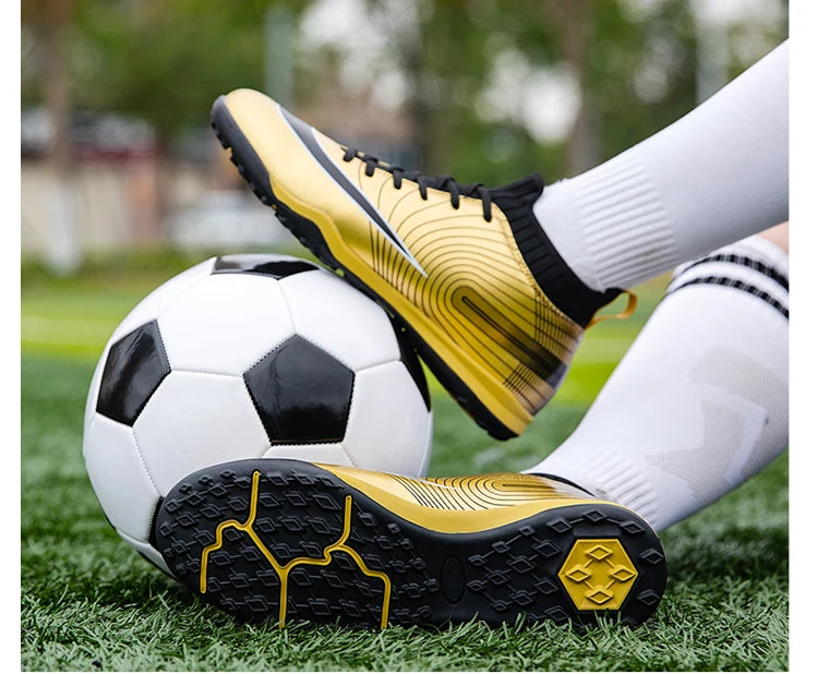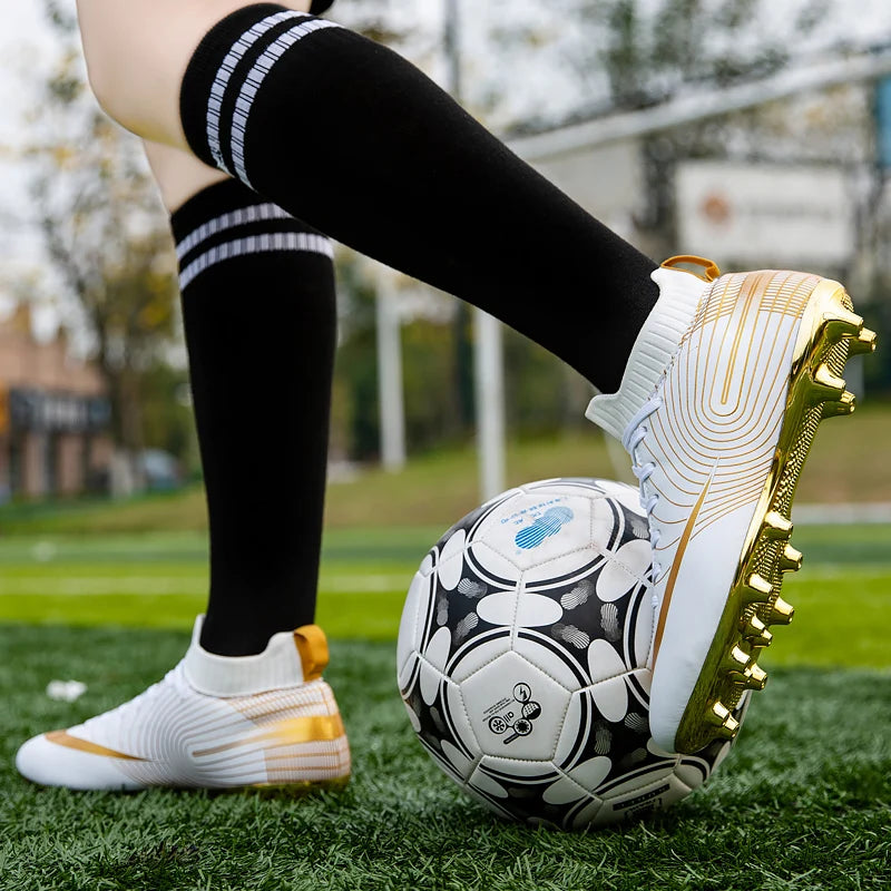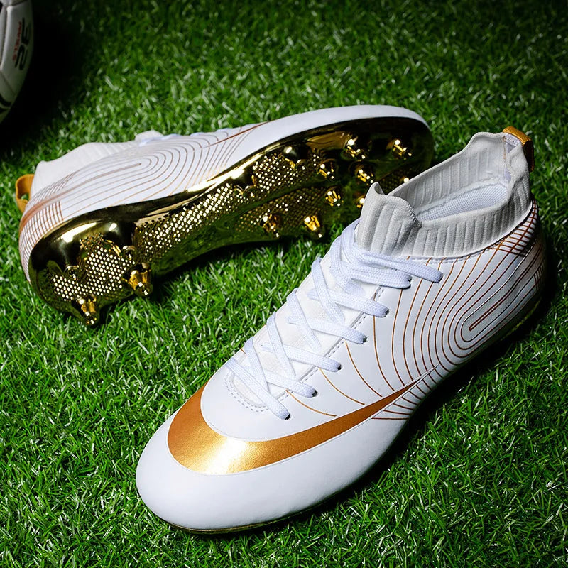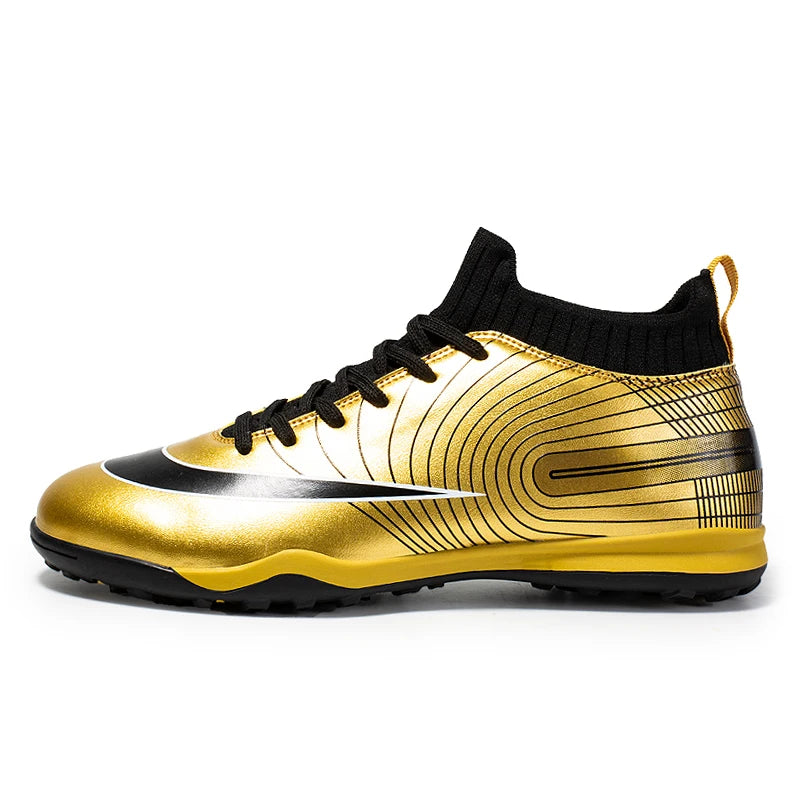 Osiągnij złoty standard na boisku z Jemru, naszymi profesjonalnymi butami piłkarskimi z błyszczącymi złotymi kołkami. Te buty zostały zaprojektowane dla graczy, którzy pragną maksymalizować swoją wydajność, oferując niezrównaną stabilność, przyczepność i szybkość na naturalnych nawierzchniach. Luksusowy złoty wygląd połączony z czarnymi detalami nadaje ekskluzywny charakter, wyróżniając je na tle innych butów piłkarskich. Dynamiczne linie na cholewce nie tylko tworzą wyrafinowany design, ale także zapewniają lepsze czucie piłki, dając ci kontrolę, której potrzebujesz podczas gry. Z naszymi butami złoto osiągniesz nie tylko w kolorze, ale i w wydajności - idealne dla ambitnych zawodników, którzy chcą błyszczeć na boisku.