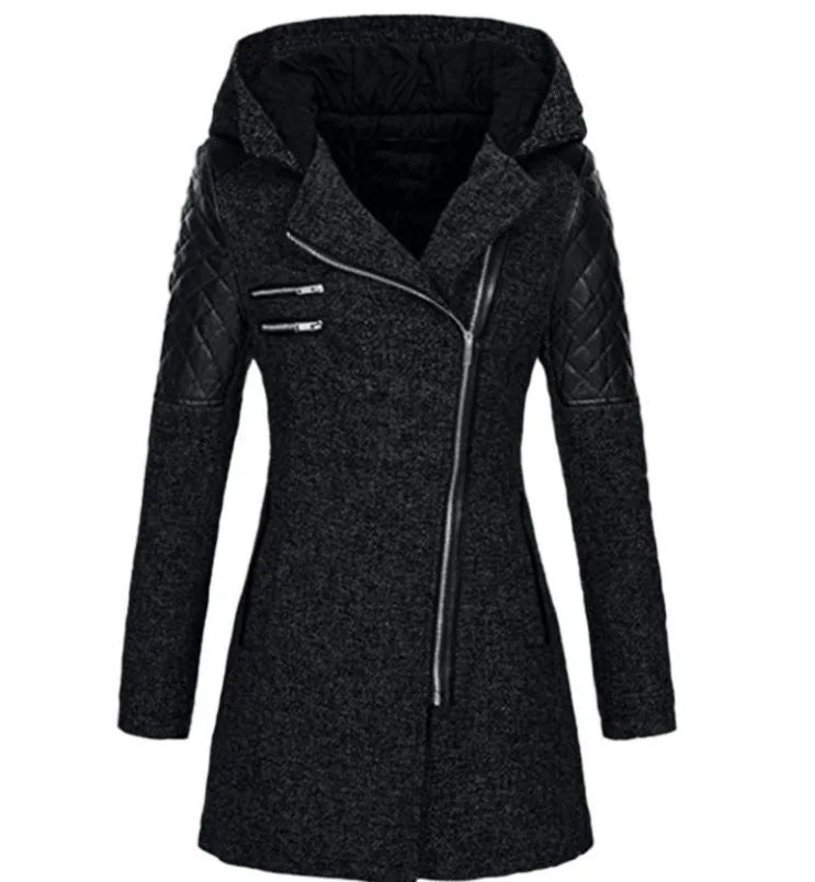 Damski płaszcz z kapturem i ekoskórzanymi rękawami – asymetryczny zamek