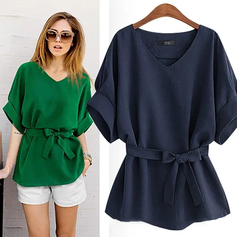 Stylowa i wygodna damska bluzka, idealna na różne okazje – od casualowych wyjść po bardziej formalne spotkania. Bluzka posiada dekolt w serek, który dodaje jej elegancji, oraz krótkie, szerokie rękawy zapewniające swobodę ruchów. Wiązanie w talii podkreśla sylwetkę, dodając całości kobiecego uroku. Wykonana z wysokiej jakości, przewiewnych materiałów, gwarantuje komfort noszenia przez cały dzień.